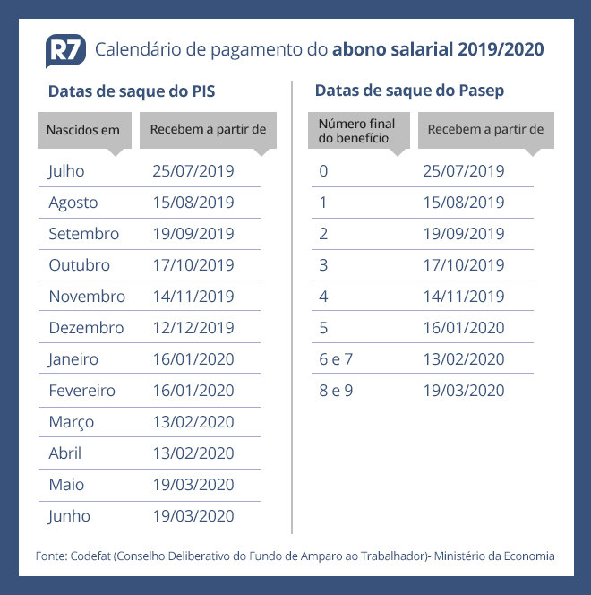 A partir desta data, os trabalhadores com direito ao benefício nascidos entre os. 1 tabela abono salarial 2020. Os trabalhadores que trabalham no setor público possuem inscrição pasep e recebem o benefício. O prazo de pagamento dos benefícios do programa acaba em março de 2020. O abono salarial 2020 é pago, no valor de 1 salário mínimo em data estipulada pelo ministério do trabalho através do calendário pis 2020, divulgado pelo mte.